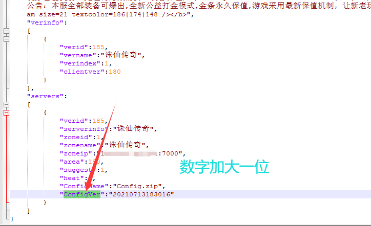 5、修改serverlist.json里面的ConfigVer,加大一位。保存,完全重新启动引擎,或者重启MYSQL和NG。
