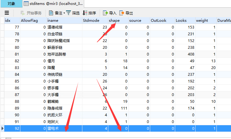 5、进入物品数据库:stditems,找到施毒术,修改shape字段数值和job一样